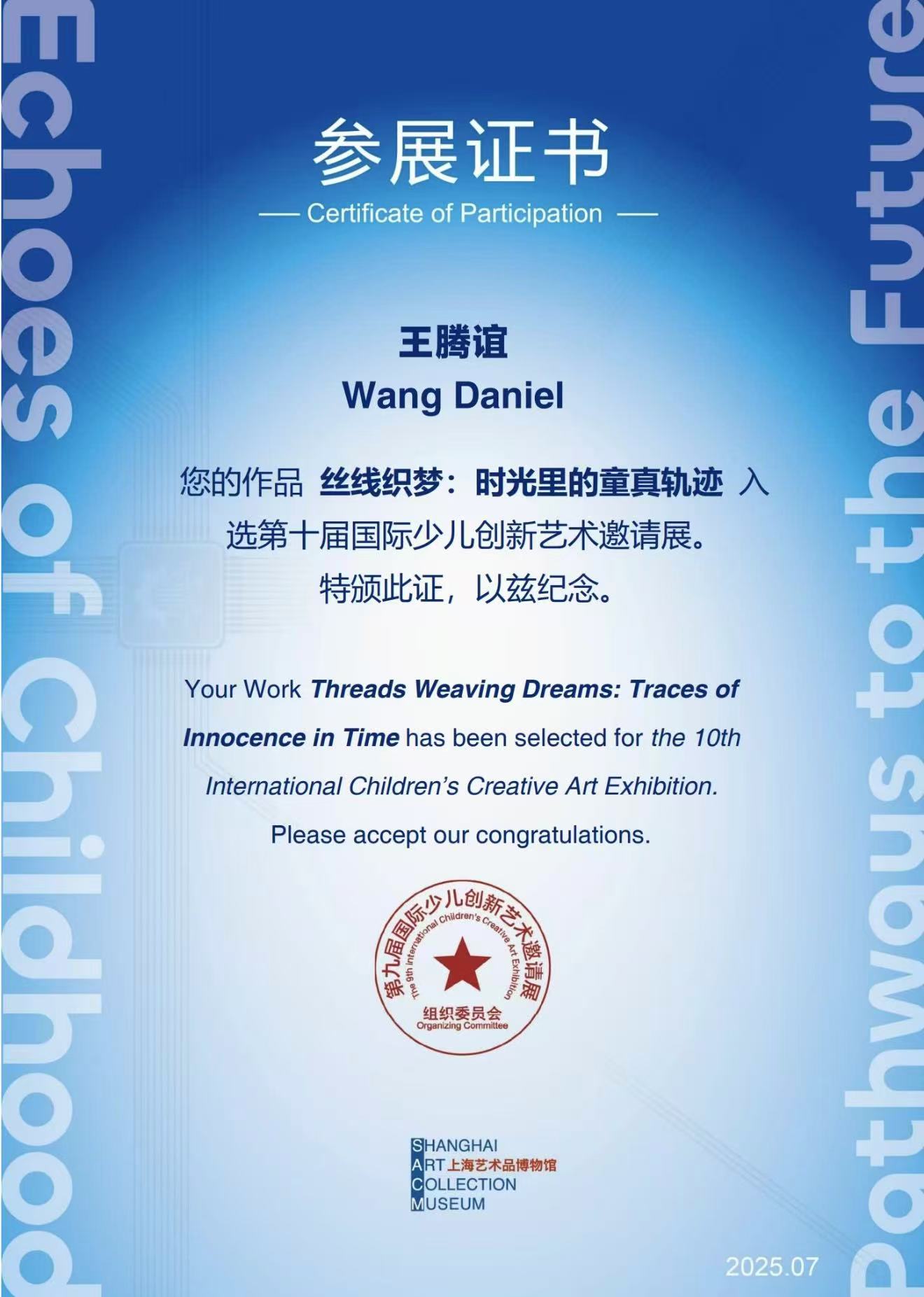 In the 10th International Children's Creative Art Exhibition, my artwork 'Threads Weaving Dreams: Traces ofInnocence in Time' has received Excellence Award